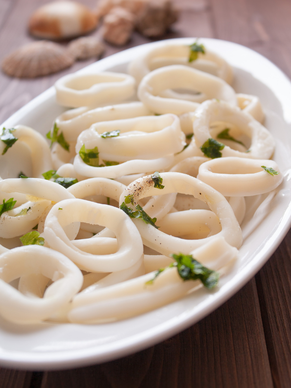 Мороженая пищевая рыбная продукция. Свежемороженые кольца кальмара. Индивидуальная заморозка
