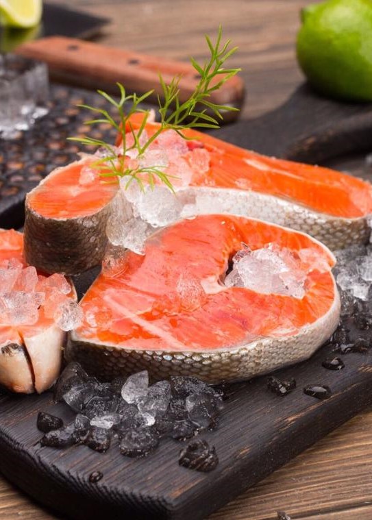 Свежемороженые стейки нерки. Мясо этой рыбы превосходит по жирности, вкусу и аромату других лососевых и считается одним из лучших рыбных деликатесов. Ярко-красный цвет мясо нерки приобретает благодаря каротиновым пигментам, содержащимся в организме ракообразных – калонидах, которыми питается рыба.